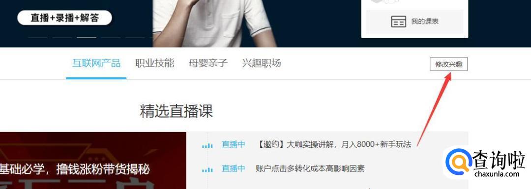 如果首页推荐的课程觉得不精确,可以如图1,点击修改兴趣;也可以点击搜索框进行搜索,如图2.