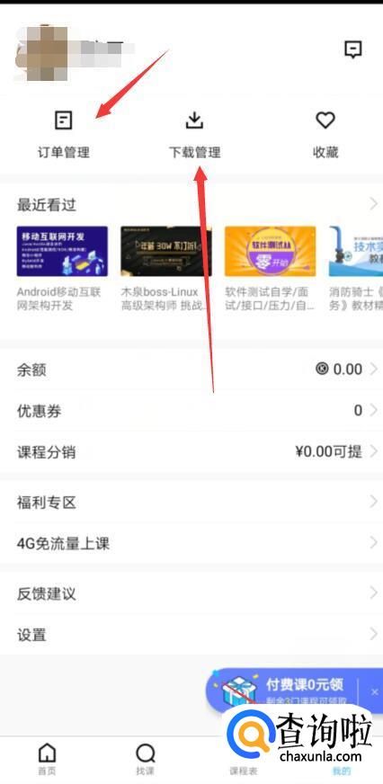 在我的页面,可以看到下载的课程等。