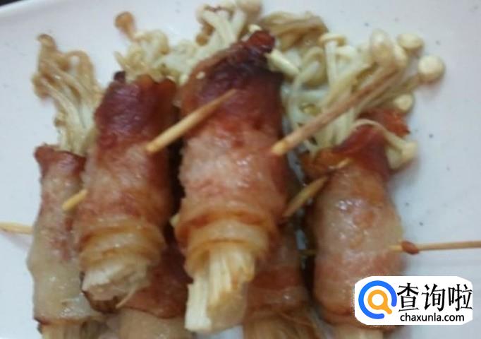 然后用把它们卷起来,用牙签固定住就好了。然后起锅小火烧油,等到油温5成热就可以放入金针菇培根卷去炸。