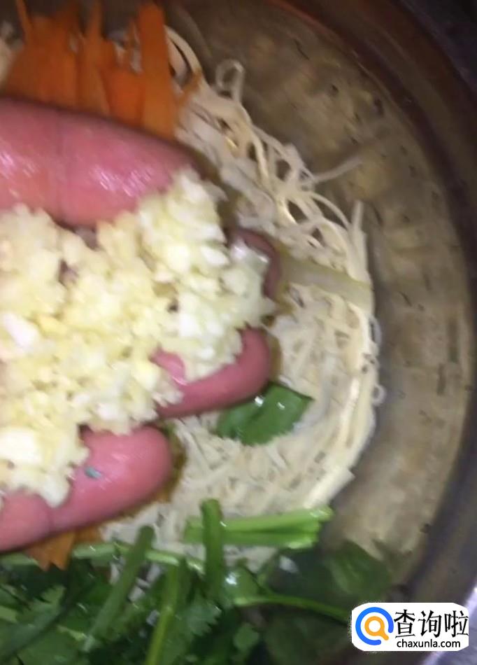 接着我们放入香菜段,蒜末,加入盐,鸡精调味,最后倒入一勺辣椒油,搅拌均匀