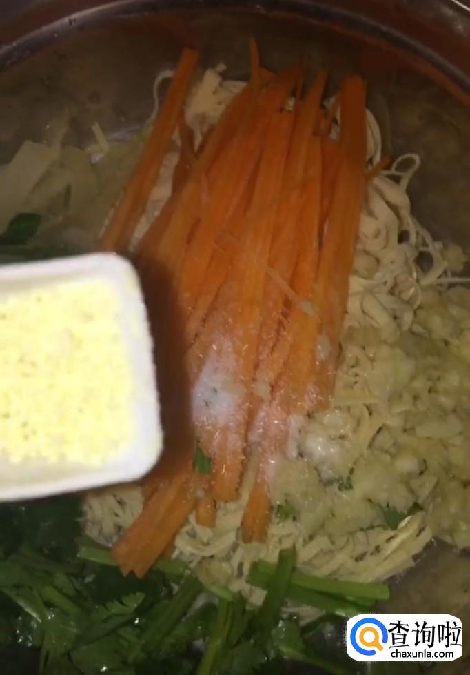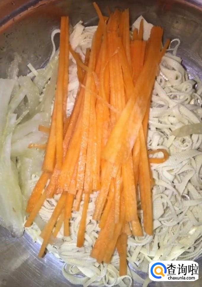 然后我们将豆腐皮过凉控水放入盆中,加入适量的洋葱丝与胡萝卜丝