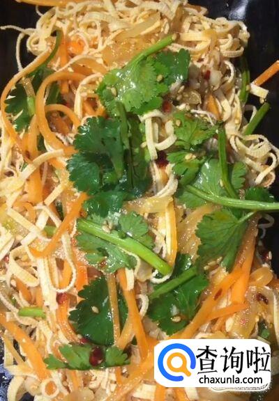 最后装入盘中,美味的凉调豆腐皮就制作完成啦!
