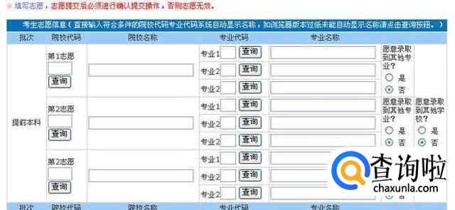 填报时的网页是这样的,你只需填学校代码。填完学校代码后,会自动浮现学校名字,然后再填专业代码,同样填完代码后,也会有专业名字。但是模拟填报,这些都是不作数的。你可以任意填,什么北大啊,清华啊,都可以。
