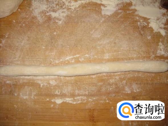 将发好的面团切成长条,揉搓之后,揪成一个个的小剂子,然后擀成厚度适中的面皮。