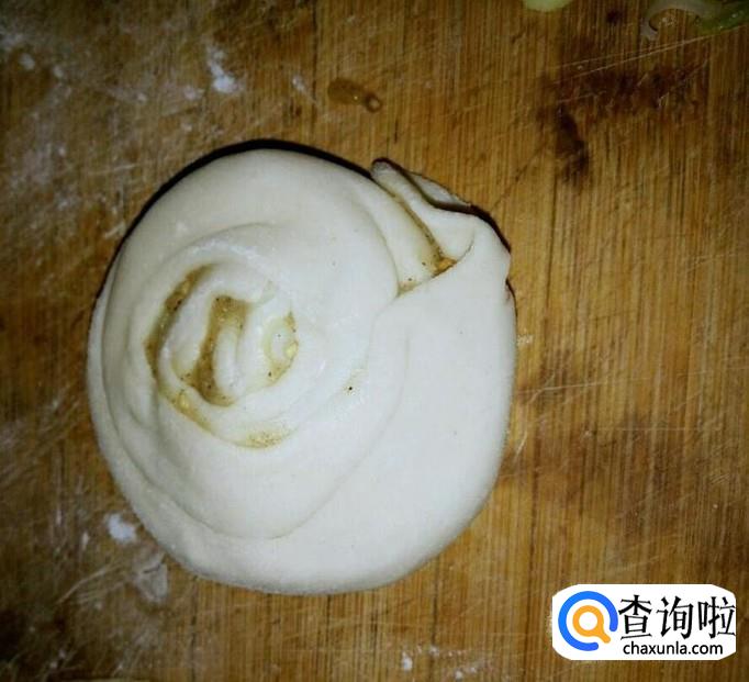 在面皮上抹上一层油酥,撒上适量葱花、盐、白糖、调料,然后,从面皮的一头将其卷起,然后,将面皮左右两边的开口处由上至下按扁,之后,再稍擀成饼,放入容器中,用布盖上,使面饼稍发五分钟左右。