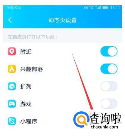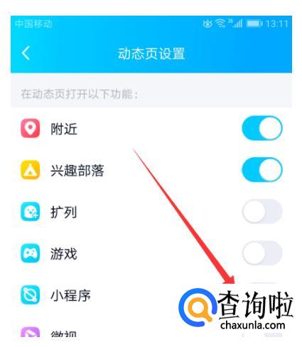 这样就可以打开动态页界面设置选项,然后找到小程序选项,点击后面的按钮即可。
