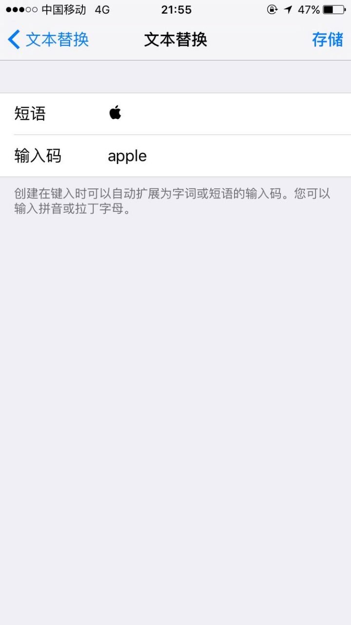 步骤简单:打开设置,通用,键盘,点 文本替换,点右上角的添加符号,然后出现短语和输入码两框,在网页上找到苹果的标志(百度上有或者这里→ ),接着拷贝,粘贴到刚刚短语那一栏,输入码可以输入自己容易记的词语,我输入的是apple,点储存按钮就OK了,之后只要打出输入码上的词语就出现苹果logo咯~
