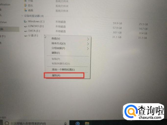 插入U盘后,选择U盘点击鼠标右键。选择“属性”,如图所示。在属性里,我们可以对一些设置进行更改。