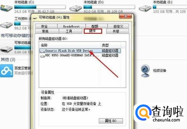 在属性里找到“硬件”,可以看见带有“USB”字样的磁盘驱动器。