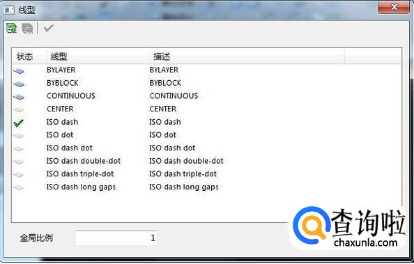 在线型对话框中选择对应的虚线线型(ISO dash),点击“√”确认后关闭窗口。(虚线类型有多种,可根据需要进行选择。)