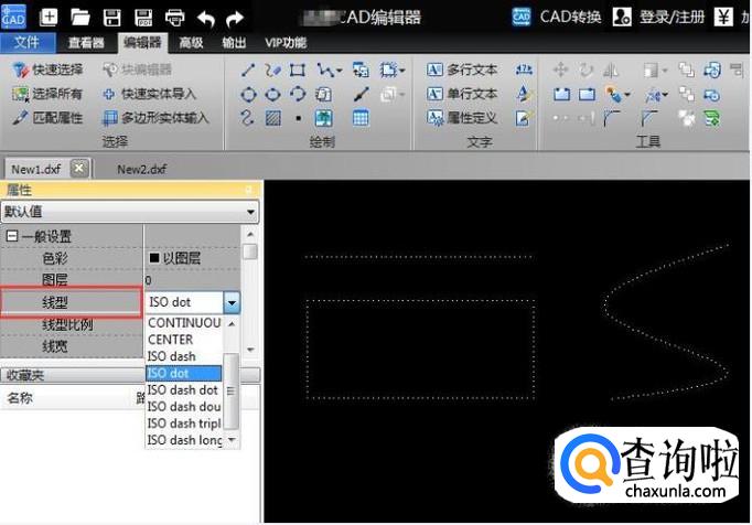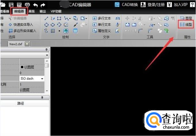在CAD编辑器顶部切换到【编辑器】界面,如果想要画虚线,在顶部属性区域点击【线型】工具,打开线型对话框。