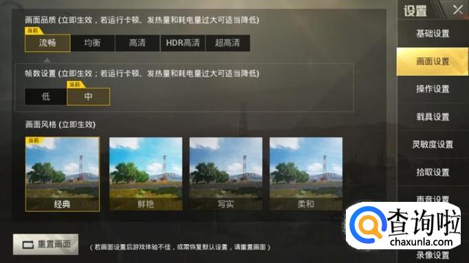 进入“画面设置”后可以在里面对界面的清晰度和画面的风格依据个人习惯进行设置。
