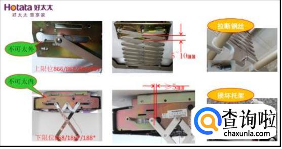 上限位:开关调整位置必须保证托架最上边的两跟折叠杆间距还有5~10mm以上;