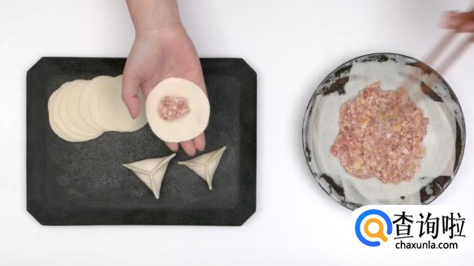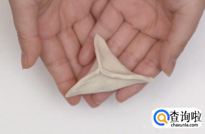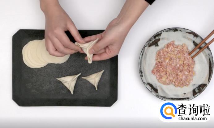 这样,一个三角形状的饺子就包好了。