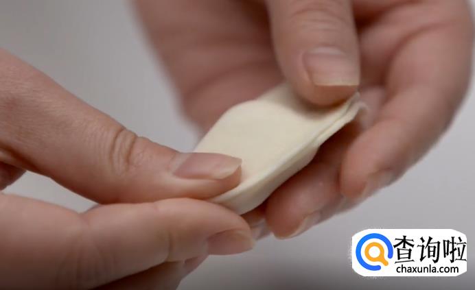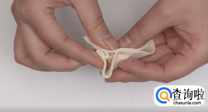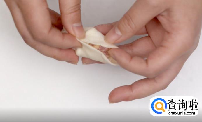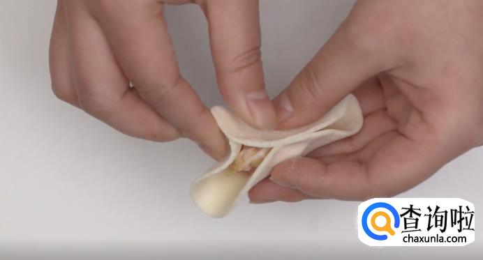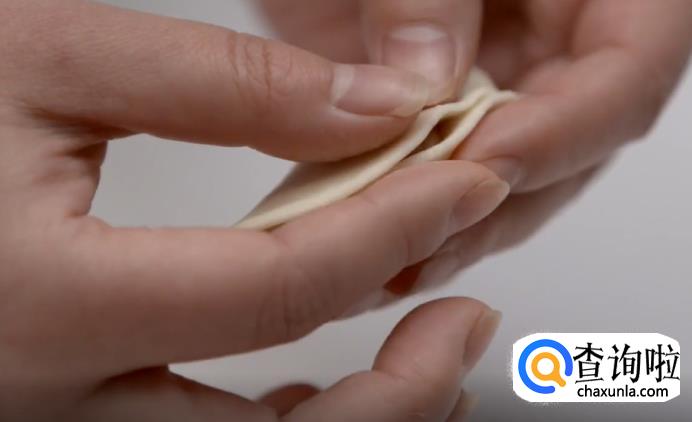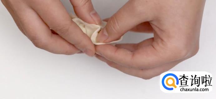 接着,将靠近粘合点的饺子皮捏出一个尖。