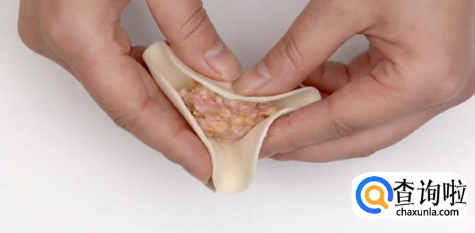 然后再将尖旁边的饺子皮捏合到一起,以此类推,直至所有饺子皮都粘合紧密。