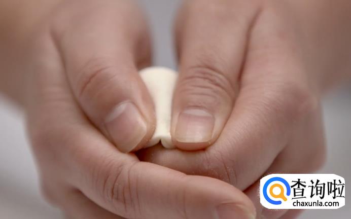 粘合好之后,将饺子两端连接在一起,让饺子呈圆形。