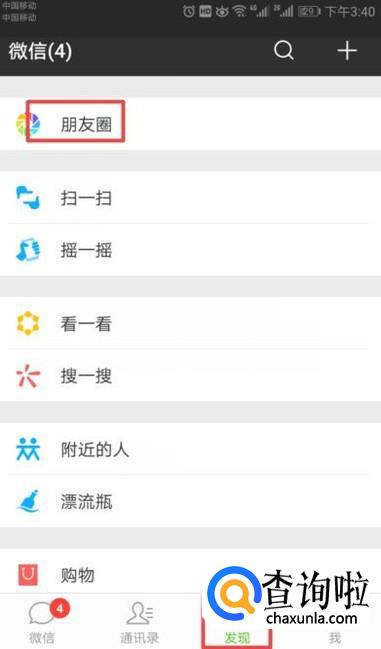 首先,我们打开我们的微信,然后我们点击发现,之后我们点击朋友圈;