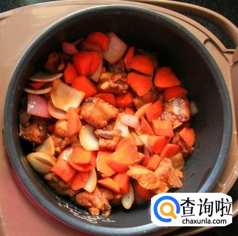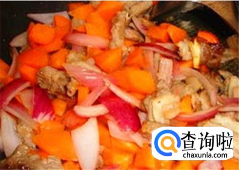 锅里倒油烧热,葱姜爆锅后把切好的胡萝卜和洋葱倒进锅里翻炒,然后把煮好的羊肉放进去,加食盐、胡椒粉、孜然粉调味,再把羊肉汤放进去。