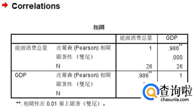 得出两变量之间的相关r系数为0.986,上面有两个"*",表示在95%的可信度之下,相关系数为0.986.如果系数上有一个“*”,则表示可信度为90%。