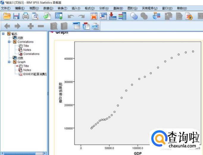 输出所需散点图,能看出两变量有显著相关性,与相关系数接近1相一致,