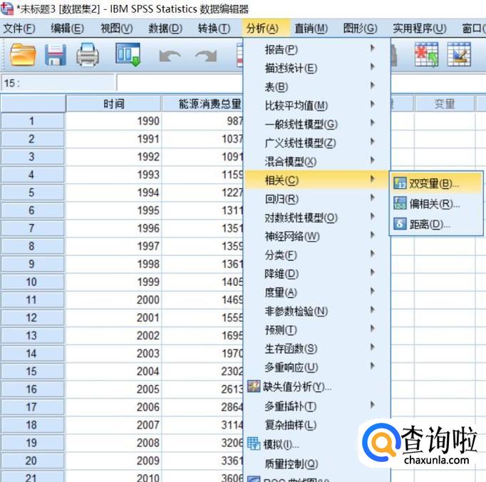 依次选择“分析”--“相关”--“两变量”,弹出对话框。