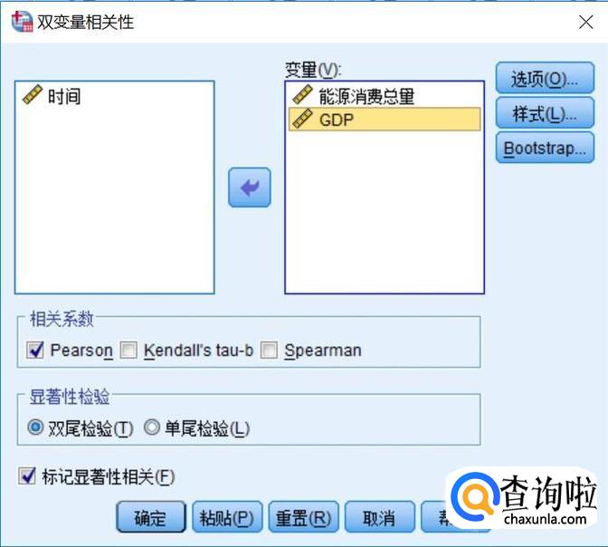 将“能源消费总量”和“GDP”依次选择进入“变量”对话框,点击“确定”。
