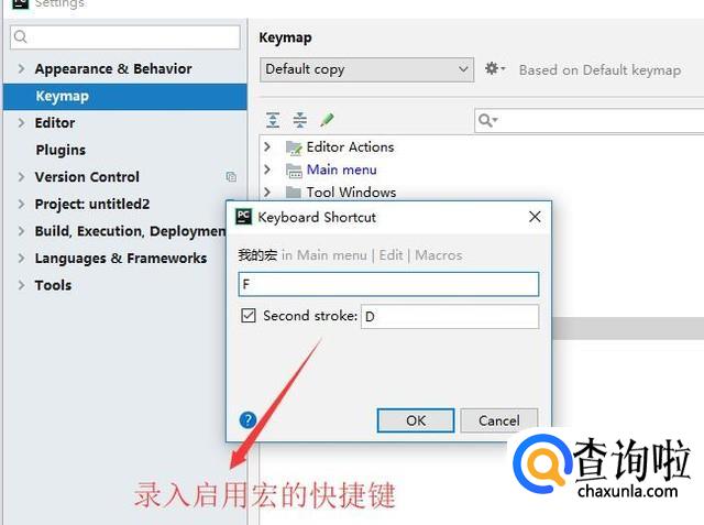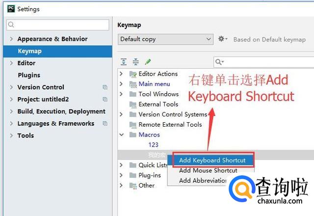 在弹出的Settings界面中定位到Keymap选项, 然后右键选择刚才创建的宏,点击Add Keyboard Shortcut选项,如下图所示
