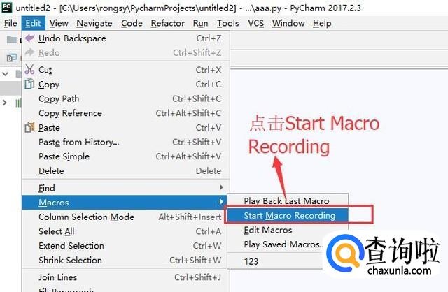 接下来点击顶部的Edit菜单,在下拉菜单中选择Macros下面的Start Macro Recording选项,如下图所示
