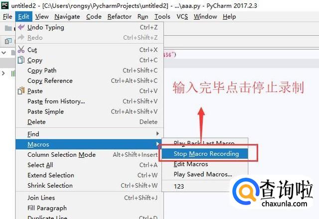 编写完内容以后,继续点击顶部的Edit菜单,这次选择Macros下面的Stop Macro Recording选项,如下图所示