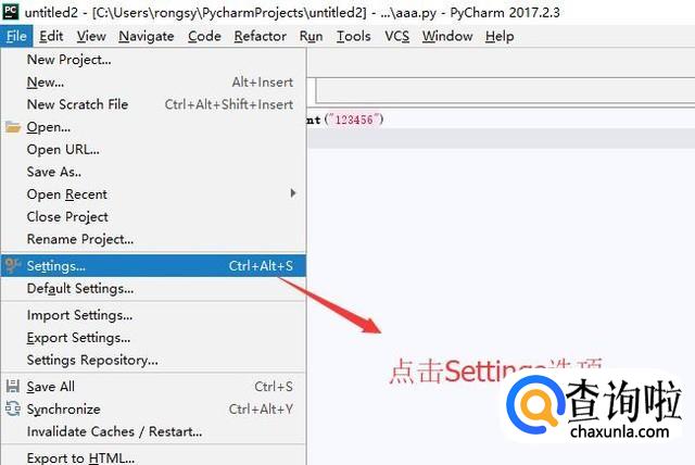 然后我们点击顶部的File菜单,接着选择下拉菜单中的Settings选项,如下图所示