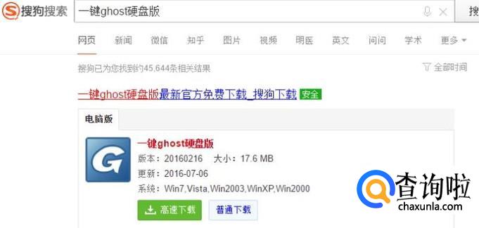 首先我们打开搜狗浏览器,搜索 一键ghost硬盘版 ,并且下载
