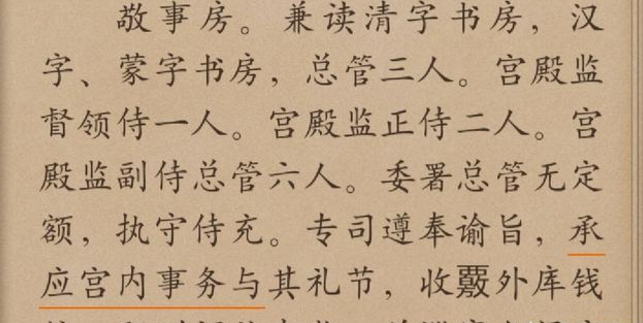 从上面文字可以看出,敬事房属于内务府中的一个部门,有相关太监任职,响应皇帝的谕旨和内务府的文书,负责钱粮收核等。