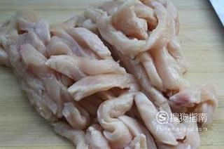将买来的鸡胸肉洗净切成条状备用,不要切太大,约五毫米宽就行了。