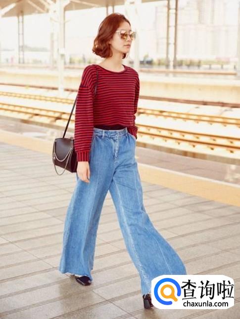 阔腿牛仔裤配条纹上衣。条纹上衣有一种温柔的美,搭配阔腿牛仔裤看起来就是一个温柔的小仙女。