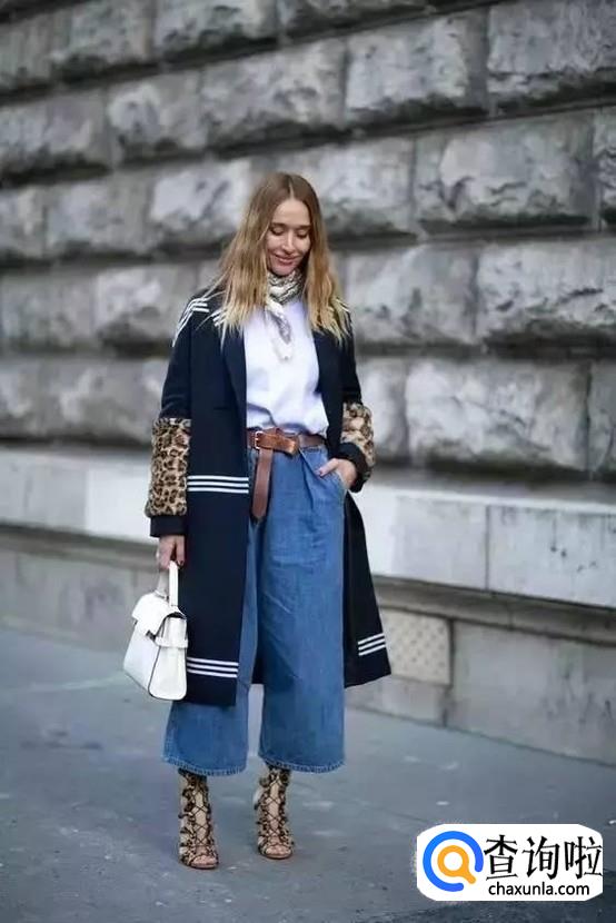 阔腿牛仔裤配长款风衣。自带气场的长款风衣搭配阔腿牛仔裤,想不成为焦点都难。