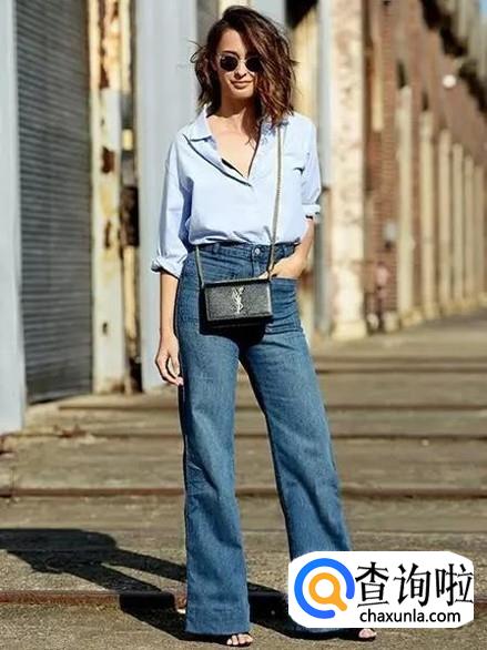 阔腿牛仔裤配衬衫。具有正式感的衬衫搭配具有随意感的阔腿牛仔裤,看上去特别养眼。