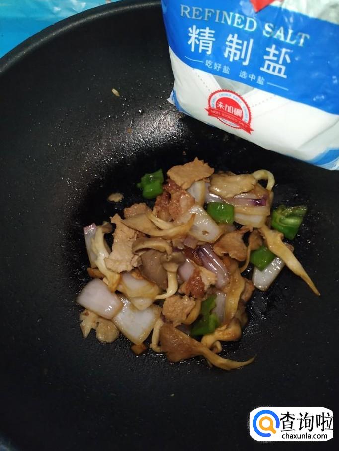 将准备好的平菇也倒入锅中,和洋葱,青椒一起翻炒。