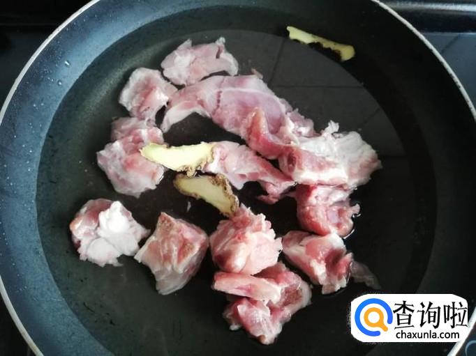 锅中添水,切两片生姜放入锅中,排骨凉水下锅焯水后捞出