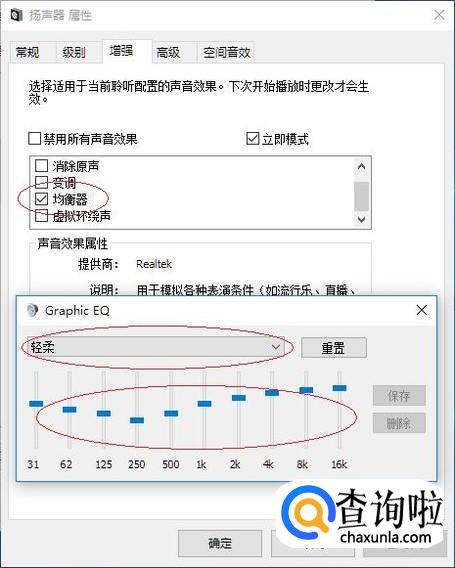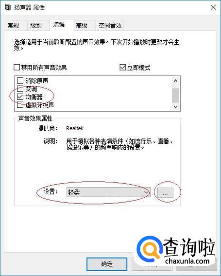 勾选"均衡器"复选框,如图所示。选择"设置→轻柔"项,点击右侧"..."按钮。