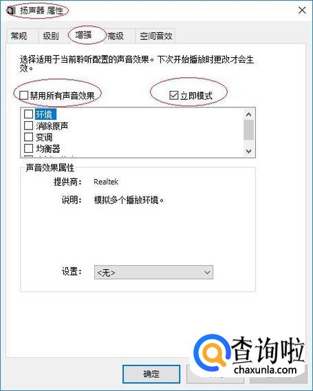 弹出"扬声器属性"对话框,如图所示。选择"增强"标签,取消勾选"禁用所有声音效果"、勾选"立即模式"复选框。