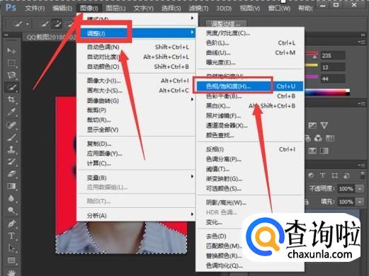 点击图像中的调整,找到色相/饱和度,并且点击。