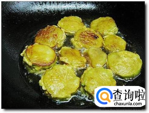 平锅里滑一层花生油,把裹满面糊的茄子片,摆放在平锅里,调小火煎制。