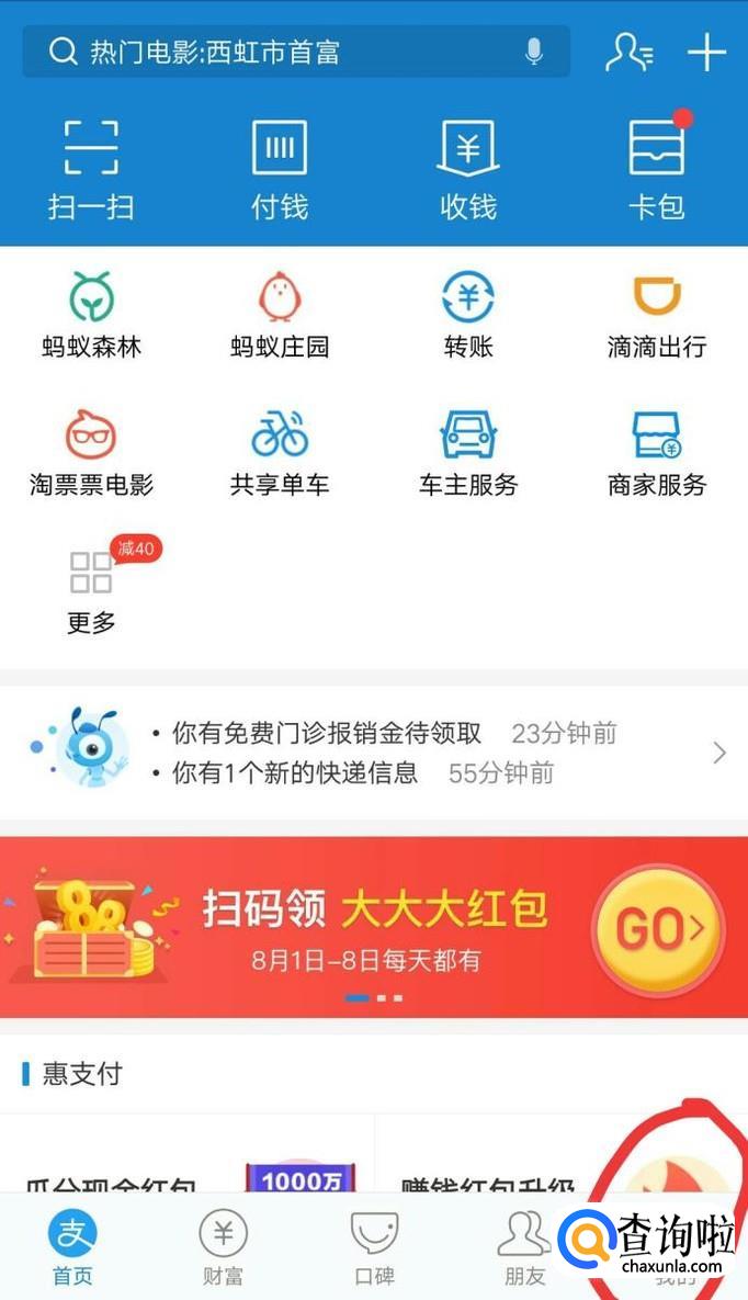 登录支付宝账号进入支付宝首页,点击右下角“我的”。
