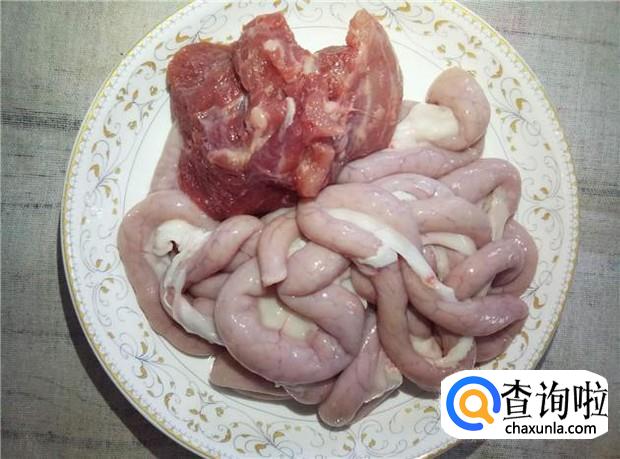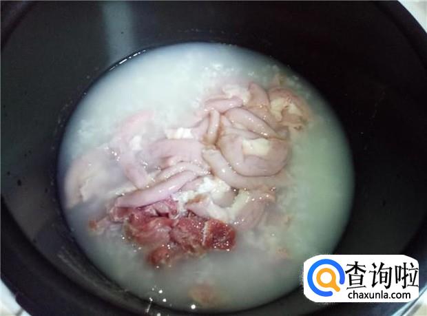 早上去市场买的新鲜粉肠和瘦肉,不要买那种苦肠哦,苦肠熬粥,粥都是苦的。