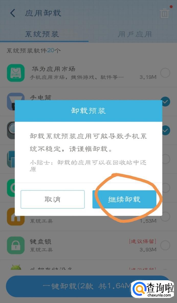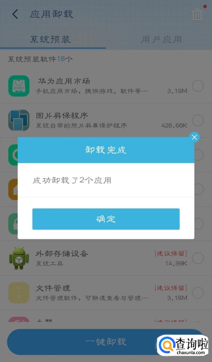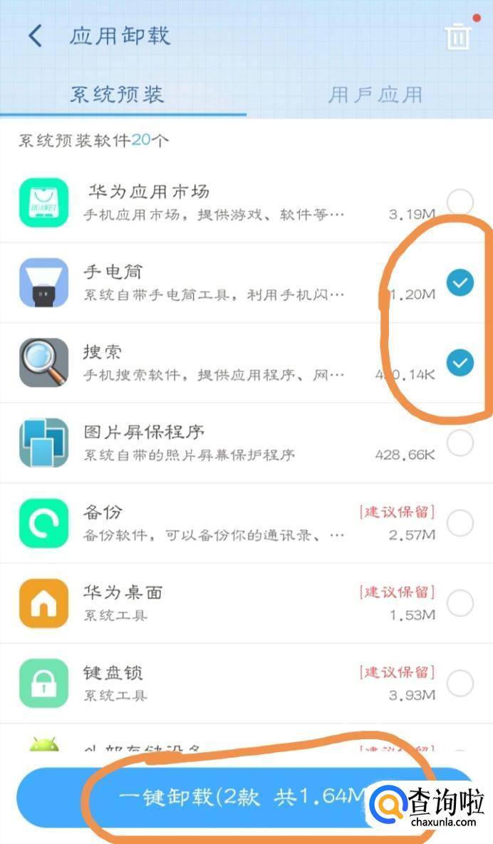 然后选择好自己想要卸载的手机自带软件,点击下方的一键卸载,开始进行卸载