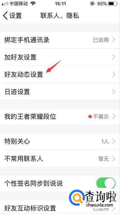 进入联系人、隐私后就能够看到好友动态的权限设置了。