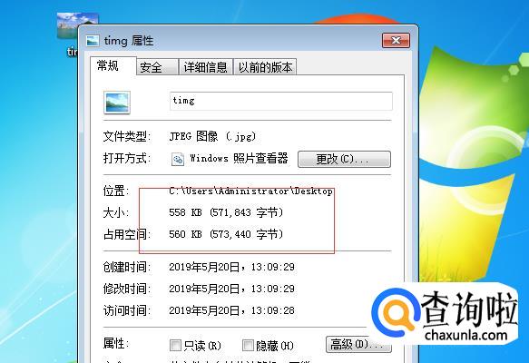 鼠标右键点击需要缩小内存的照片,选择“属性”,就会弹出以下界面,可以看到照片的内存大小为558KB。