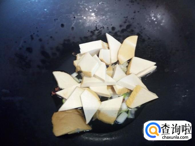 锅里放入油加热,油热后放入花椒,葱,姜爆锅。放入素鸡翻炒。