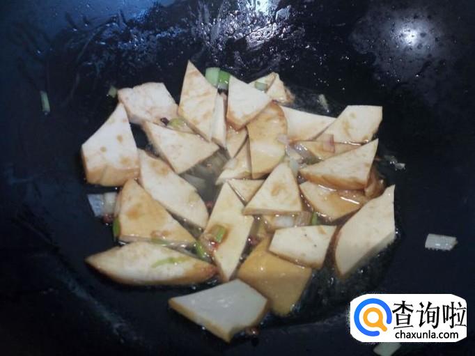 放入少许料酒,一小匙儿蚝油略翻炒一下,然后放入少量的水,这样炒出来的素鸡比较软。